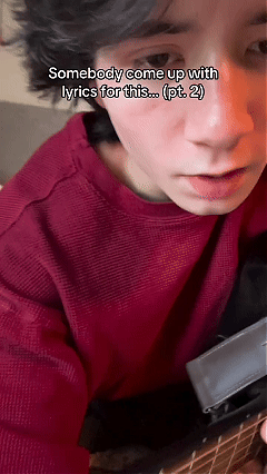 In this Reel, a musician sits with a guitar, hums a melody, and asks people to write the lyrics.